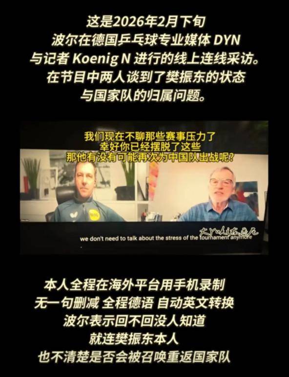 波尔作为樊振东在海外最要好的挚友,两人亦师亦友相处多年,在2月底德国媒体的专访中,波尔没有再遮掩,直言目前国乒并没有主动联系樊振东商谈回归事宜,就连樊振东自己都不确定何时能收到国家队征召。
